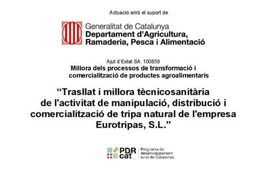 Amb l’ajuda del Programa de Desenvolupament Rural de Catalunya finançat pel Departament d’Agricultura, Ramaderia, Pesca i Alimentació, EUROTRIPAS, SL ha aconseguit  una modernització de les seves instal·lacions i una millora tecnico-sanitària dels seus processo d’acord a les noves normatives d’exportació.